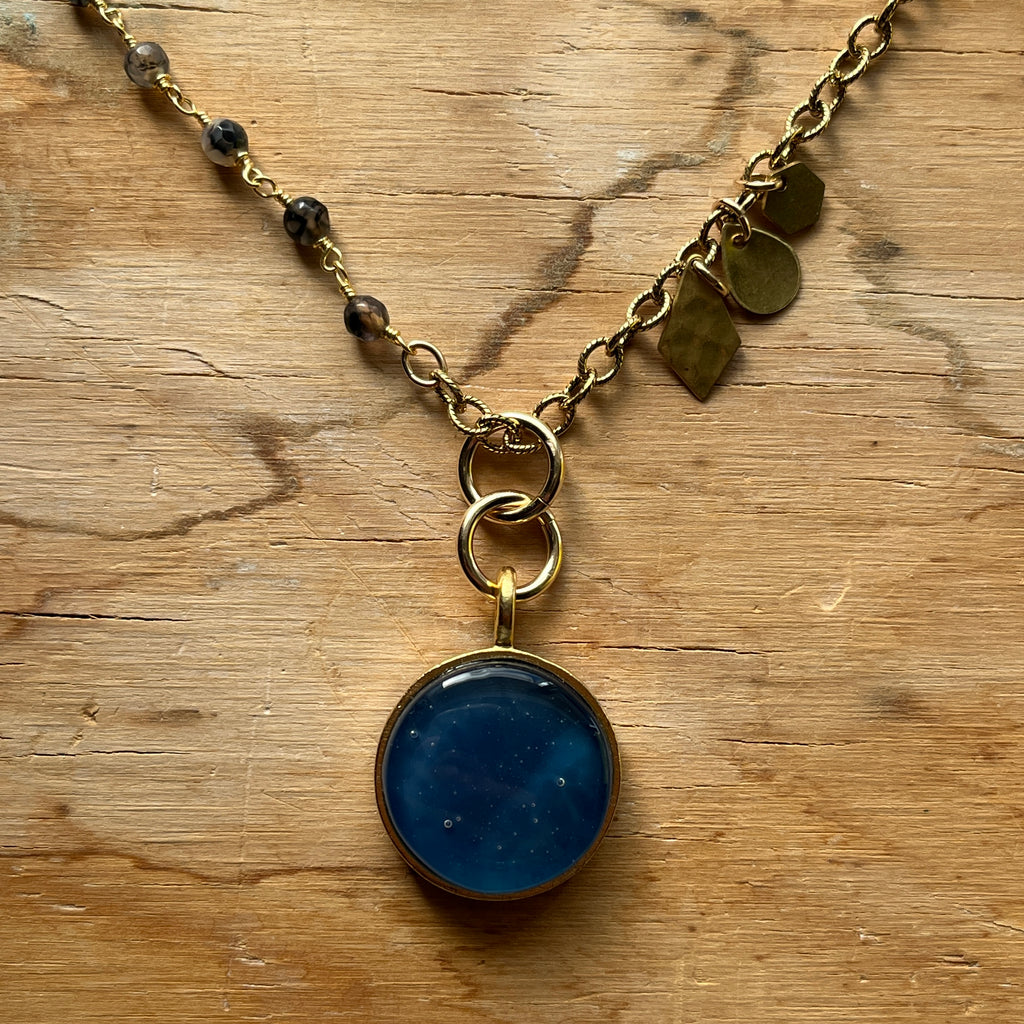 grey/black/white quartz stone beads adorn one side as well as 3 brass charms.