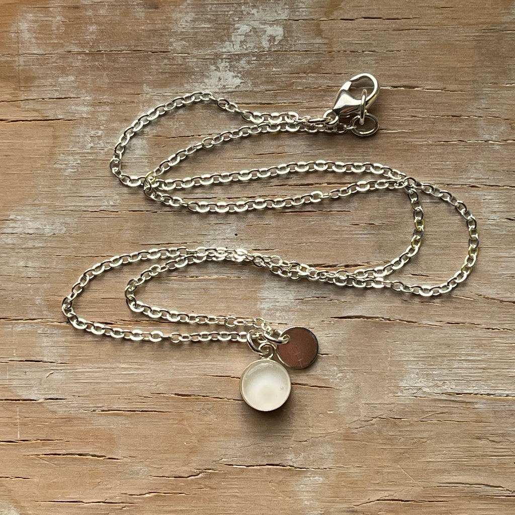 A tiny sterling silver circle charm hangs alongside the glass pendant.